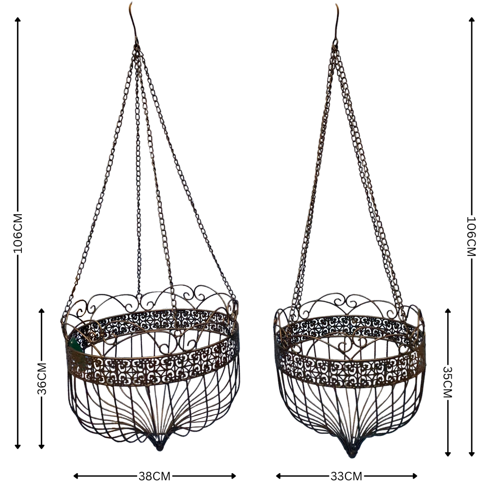Hanging Metal Ornate Basket Planter Holders. Plant these up with tumbling succulents, mondo grass, or a boston fern. These diverse planters are a must for any space that needs a hanging focal point. These are ideal for under a patio, tree or inside an apartment, just hang up and enjoy. You will LOVE LOVE LOVE these.